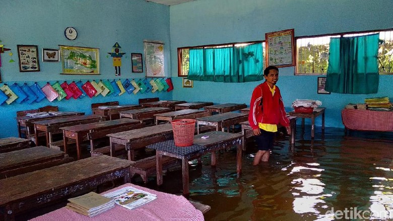 Banjir yang masuk ke ruang-ruang kelas setinggi betis orang dewasa. Kegiatan berguru mengajar di kedua sekolah tersebut terpaksa diliburkan.