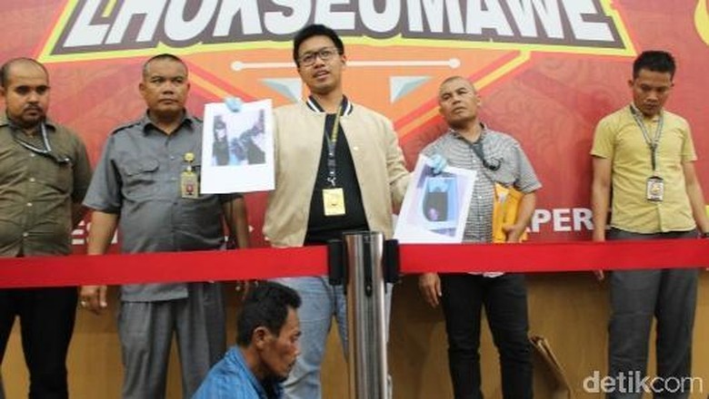 Pelaku di Mapolres Lhokseumawe. (Datuk Haris Molana/detikcom)Lhokseumawe -Ira Wati (35) bersama dua buah hatinya Zikra (14) dan Yazid berusia 1,5 bulan tewas di rumahnya di Desa Ule Madon, Kecamatan Muara Batu, Aceh Utara, Aceh. Ketiganya tewas sesudah ditikam oleh suami ketiganya, Aidil Ginting (40).