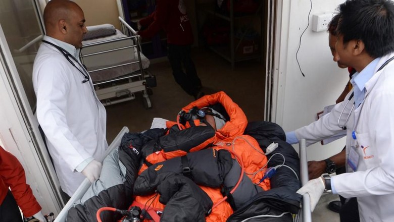 Chin Wui Kin ketika gres diselamatkan dari Gunung Annapurna (Photo by PRAKASH MATHEMA/AFP)Kathmandu -Seorang pendaki asal Malaysia tewas sehabis diselamatkan dari Gunung Annapurna di Nepal. Pendaki yang berprofesi sebagai dokter ini meninggal dunia ketika menjalani perawatan medis di Singapura.